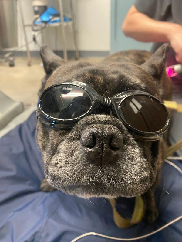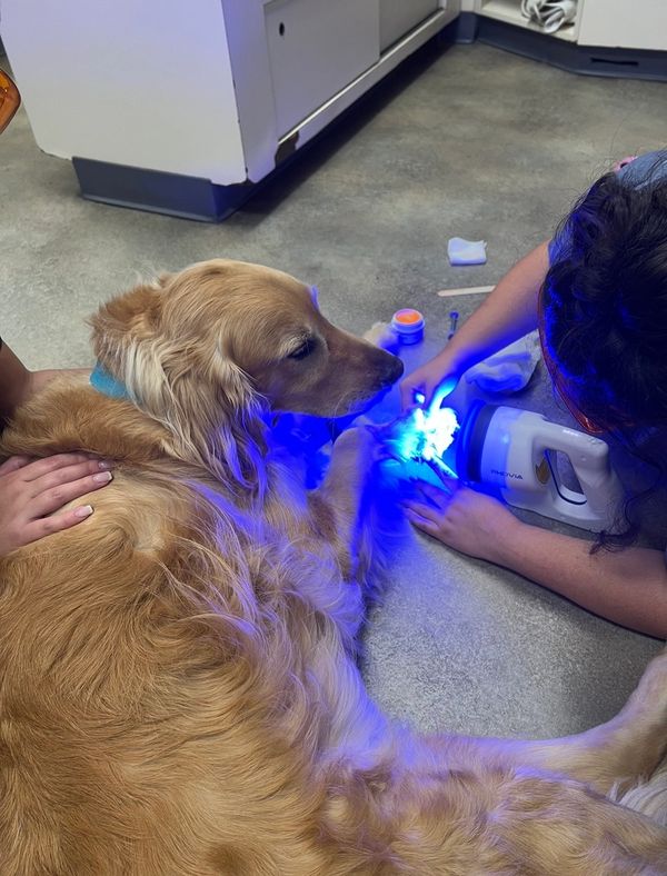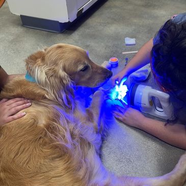 Laser treatment for dogs involves a deep-penetrating light to promote a chain of chemical reactions known as photobiostimulation. This process helps relieve pain through the release of endorphins, and it stimulates injured cells to heal at an accelerated pace. During a treatment session, the handheld laser wand is slowly moved back and forth over the damaged tissue, producing a warm, pleasant sensation that most pets seem to enjoy and find relaxing.